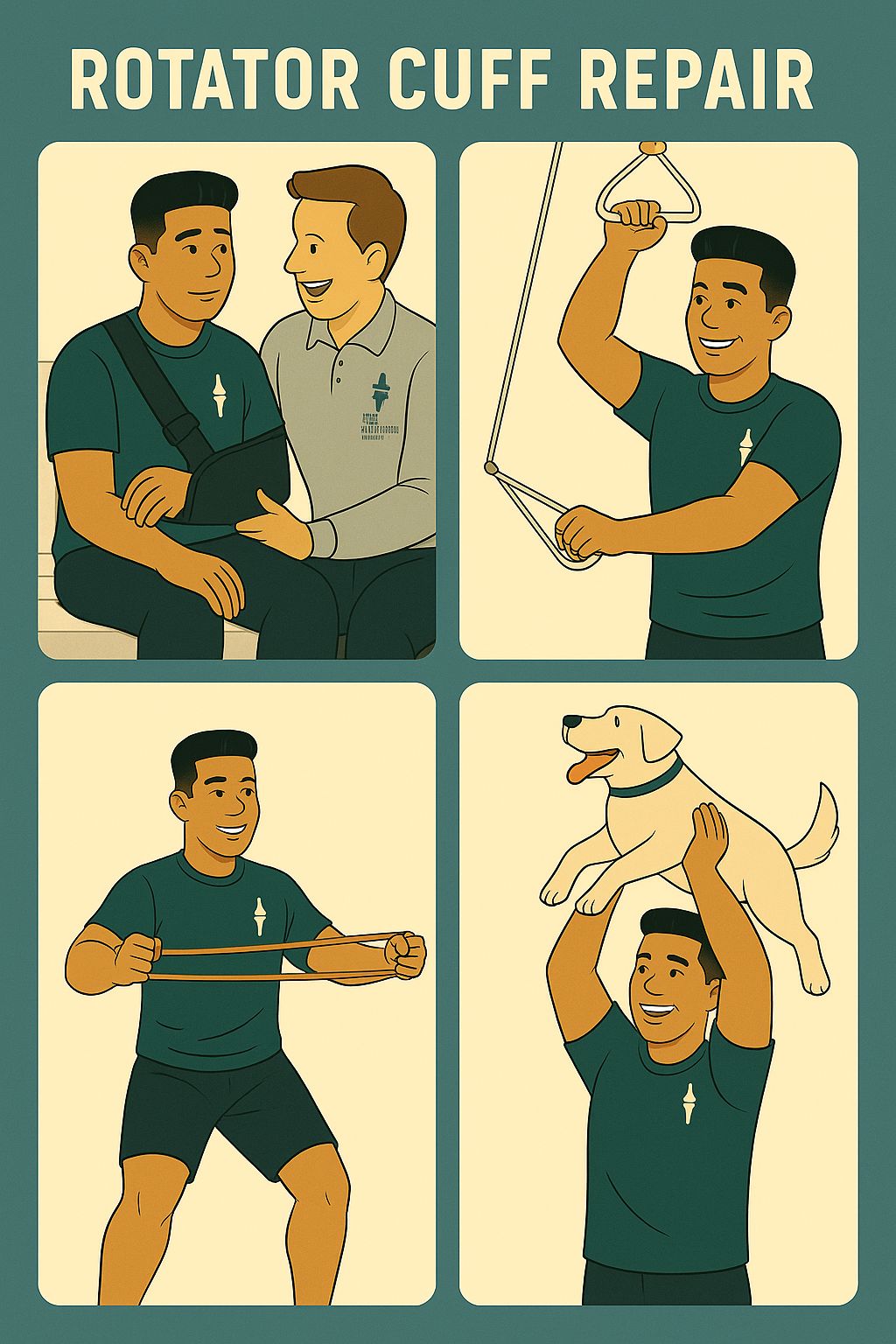 Rehab keys: Protect healing tissue early → restore shoulder motion → strengthen cuff, deltoid, and scapular muscles to provide stability.